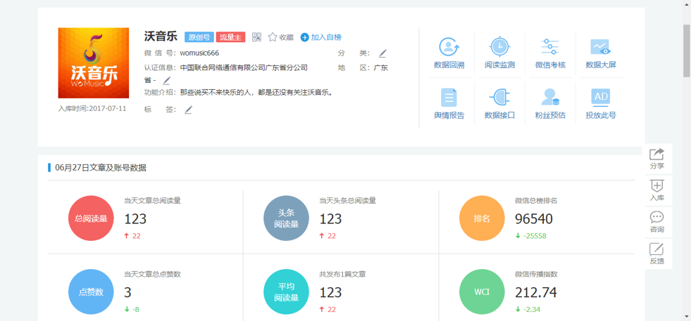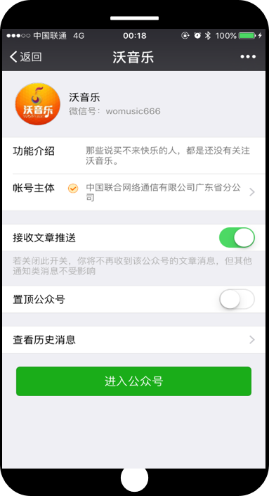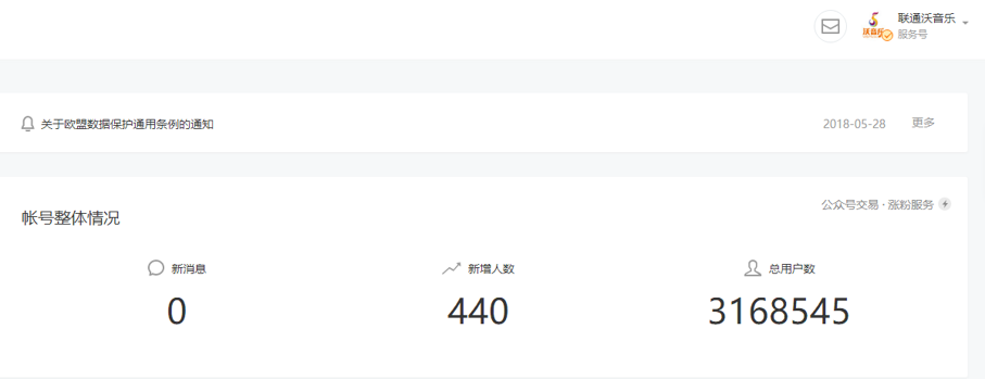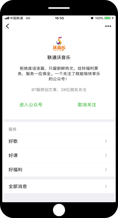 从2016.8月开始,思进新媒体部运营联通沃音乐官方服务号,自运营以来,联通沃音乐服务号微信公众号月阅读量达624836次,粉丝数从0增长至316万+ (截止2018年6月28日)!!在沃音乐服务号的运营工作中,热点娱乐选题的制定,走心音乐业务内容的撰写,打破了传统运营商官微的固有思维,运用多样化的内容以及活动有效得维系了粉丝的粘性,并有效扩大了品牌的曝光度!