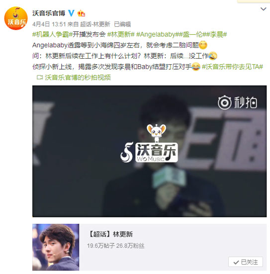 思进新媒体部运营联通沃音乐新媒体项目以来,根据平台特点及粉丝用户人群画像,深入分析沃音乐粉丝人群画像,并根据其人群特点,精心打造话题活动互动机制、打造明星独家猛料、大V互撩战略合作模式等多种方式或渠道,运用多样化的内容以及活动有效得维系了粉丝的粘性,并有效扩大了品牌的曝光度!