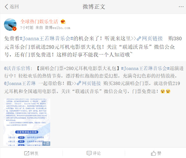 从2016.7.5日开始,思进新媒体部开始执行沃音乐新媒体的3个平台的运营:沃音乐官博,沃音乐官微(服务号/订阅号)。2016-2017年是@沃音乐官博运营取得重大突破的一年,我们站在粉丝经济的风口,破亿的阅读量带来强势的品牌曝光逆袭了通信行业的传统微博运营。 2018我们将持续加强特色化运营,更注重媒体化发展, 深耕年轻群体的市场,实现品牌传播与销售转化,成为行业中玩转粉丝经济的标杆。
